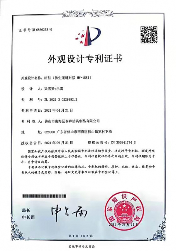 外观专利-单人方形浴缸(无缝对接1868)